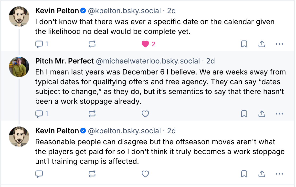 I respect Kevin's perspective, but it really is semantics. The big issue in the way is free agency, which is coming up in the matter of weeks – at least for negotiations.