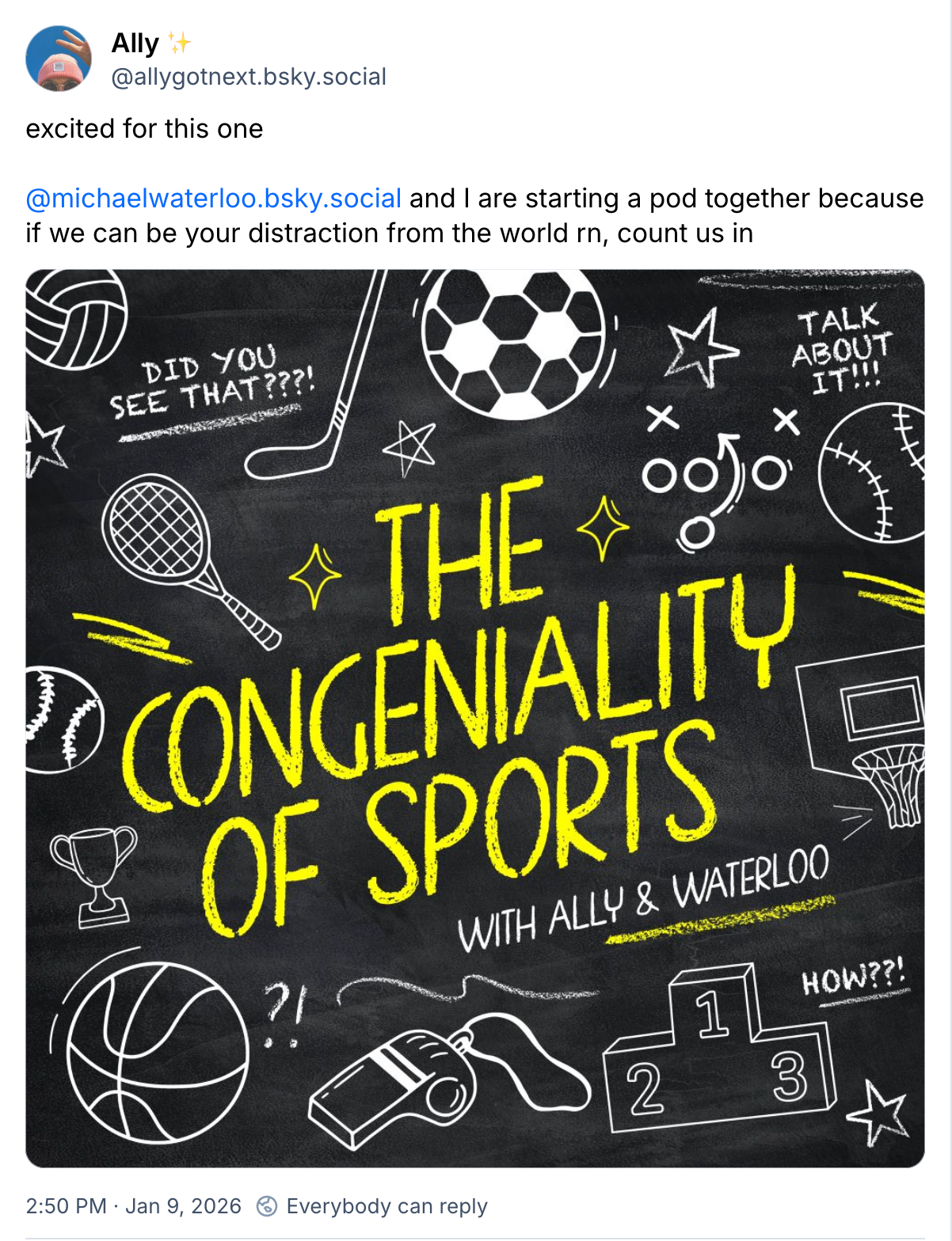 Join us each episode where we talk hoops, baseball, basketball, women’s sports, men’s sports, niche sports, fun sports moments, and whatever else is lighting up our feeds and or brains that week. Some episodes are deep dives, some are vibes, some will have guests, but all of them are rooted in our genuine love of the game.
