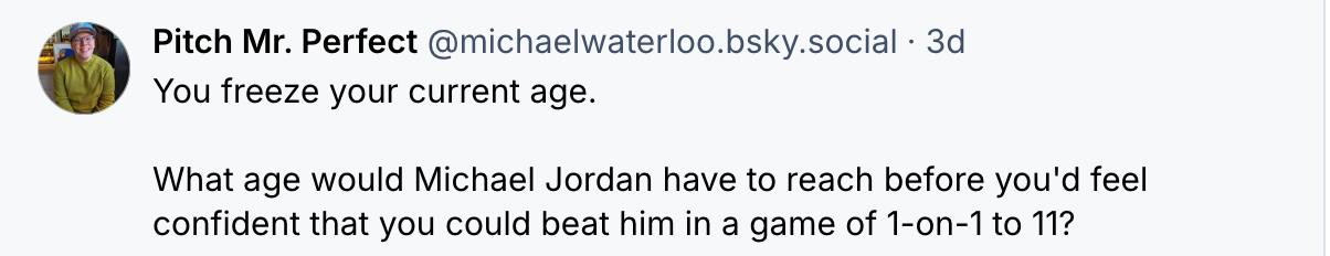 How old would he have to be for me, an out-of-shape 39-year-old terrible basketball player with a high basketball IQ, whose best actual skill is his court vision and making the right pass, to beat him?