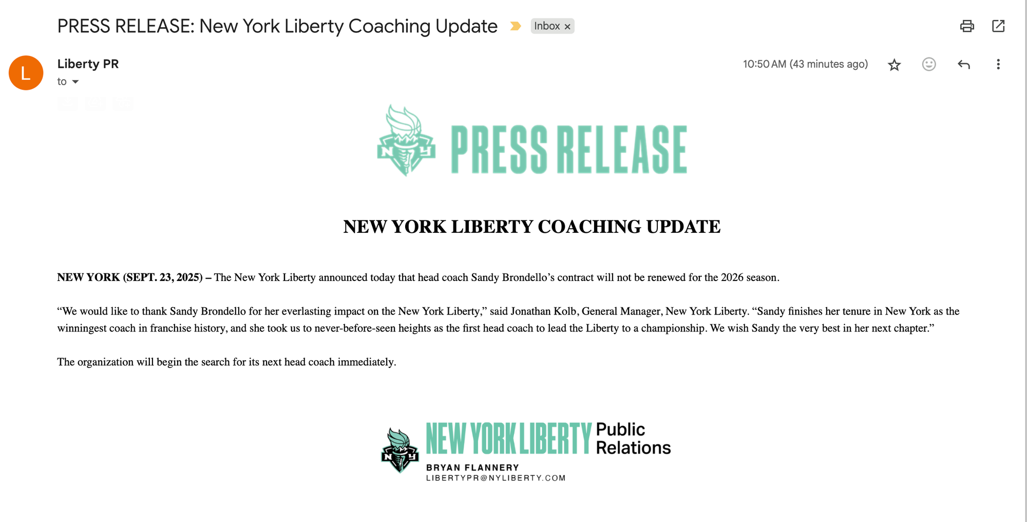 This is an utter shock. Days after Noelle Quinn (understandably) was fired from the Seattle Storm, the New York Liberty announced that they won't be bringing back Brondello.