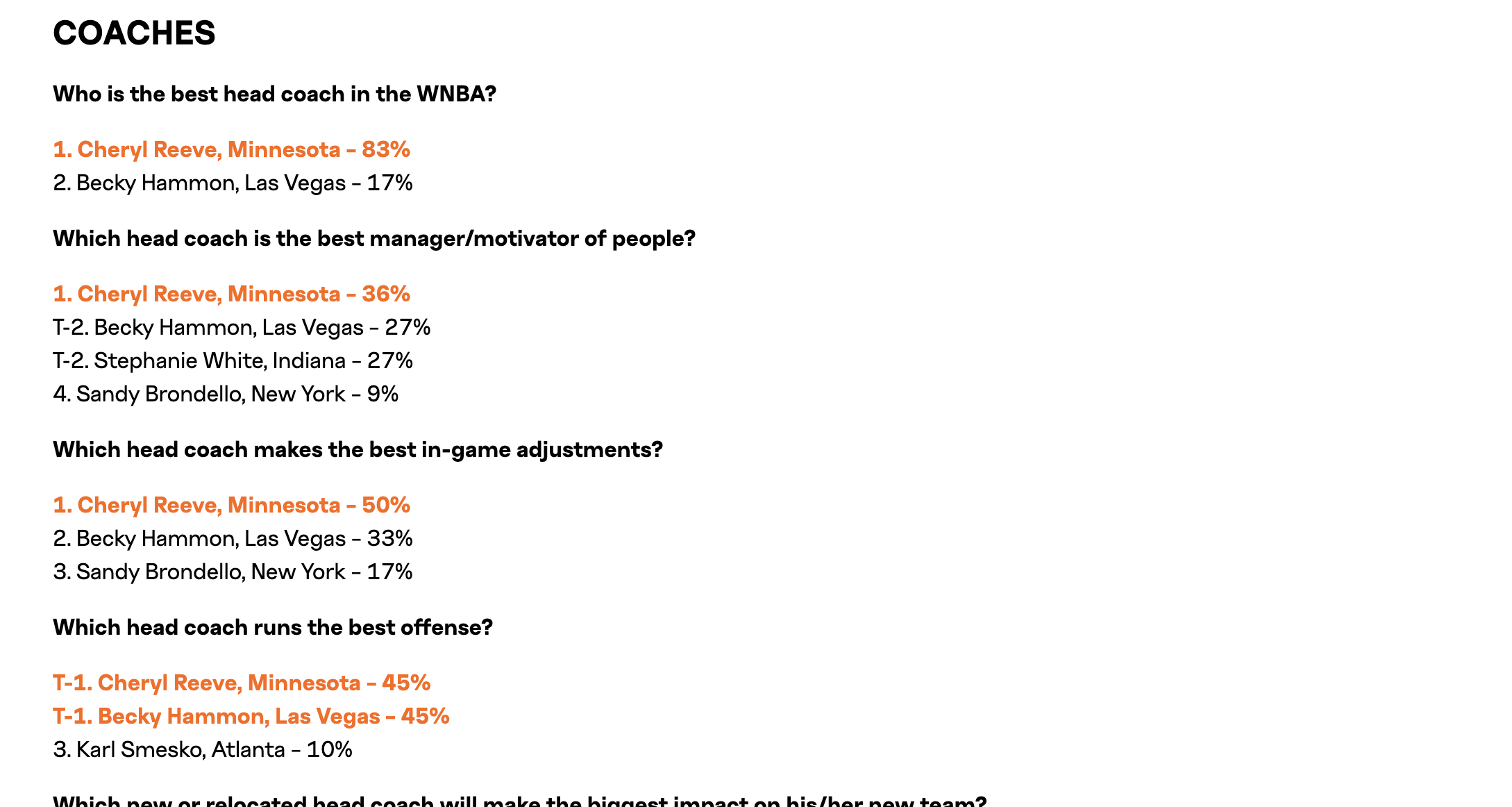 Having her behind Reeve and Hammon makes sense. Same with Stephanie White. Hell, I'll hear the argument about having her behind Natalie Nakase, if you want. But Brondello is no worse than the fifth-best head coach in the league, and I would have her No. 3 on my list.