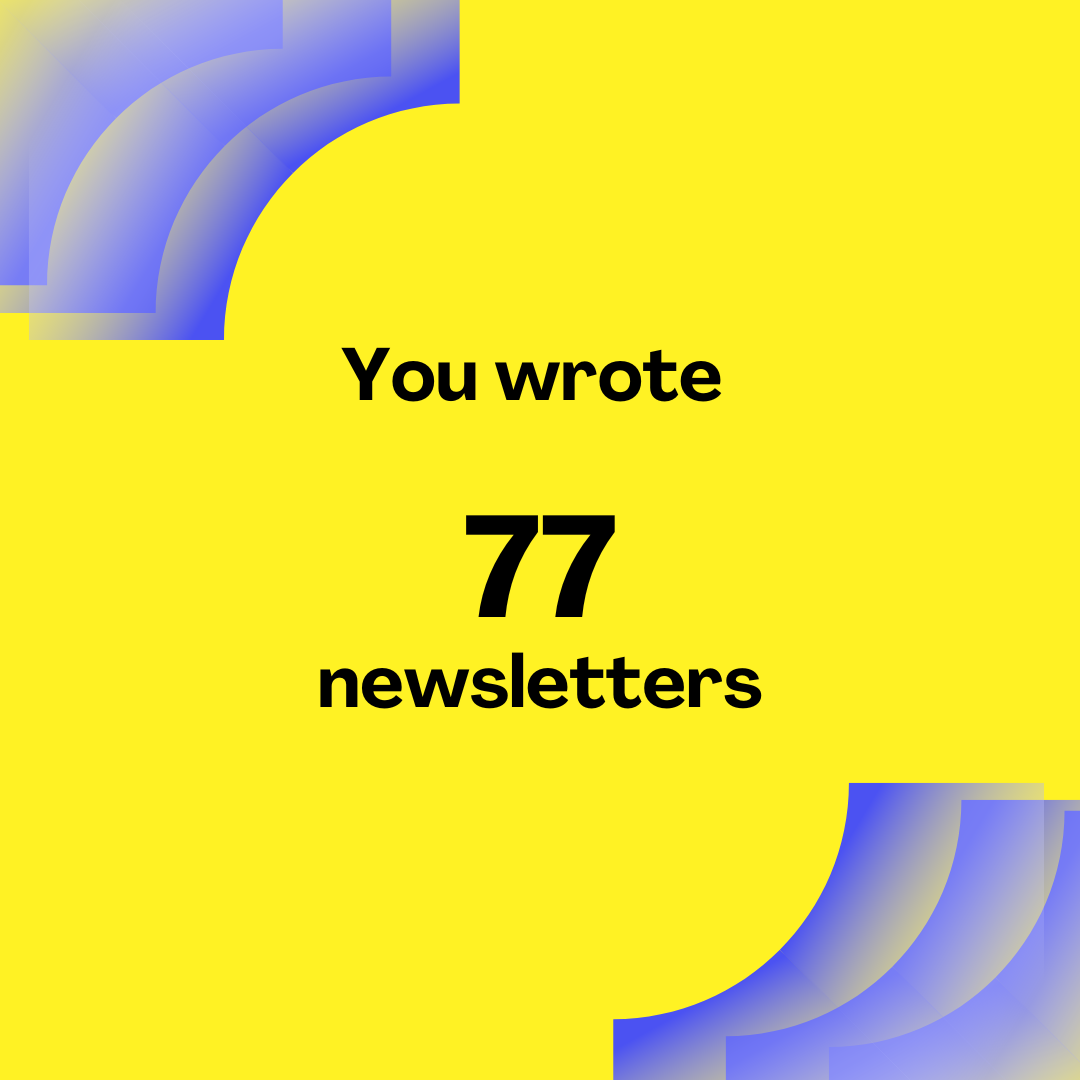 The goal was to write two newsletters per week. I started in February, and this is the 77th one that I have written. I missed a week for vacation and life, but there were a few three-newsletter weeks that made up for it.